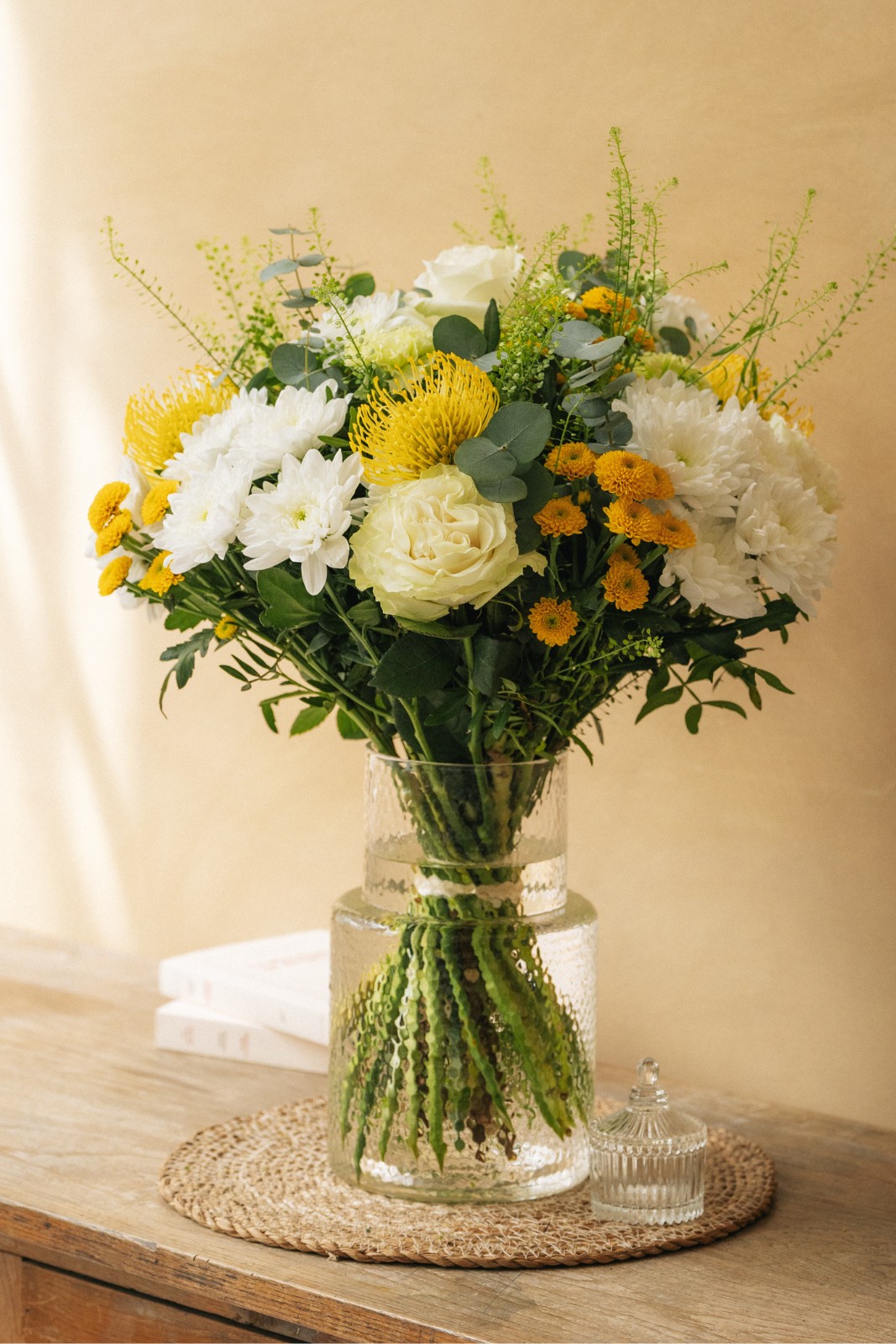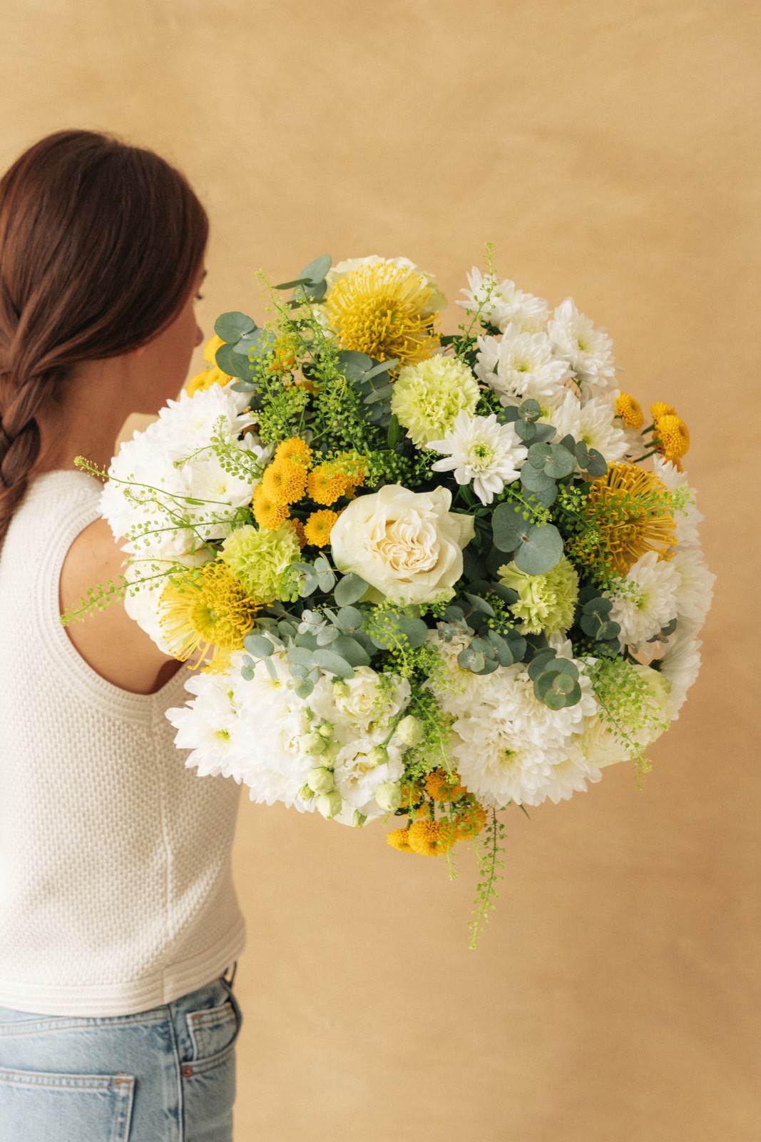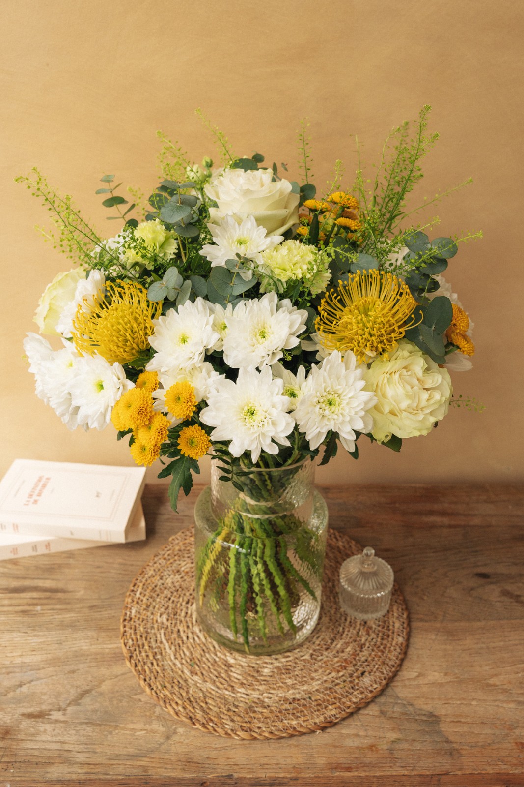 Les fleurs sont des produits naturels et récoltés au dernier moment auprès de nos producteurs. Il se peut que selon les conditions météorologiques, indépendantes de notre volonté, il y ait quelques différences de couleurs/variétés dans le bouquet.